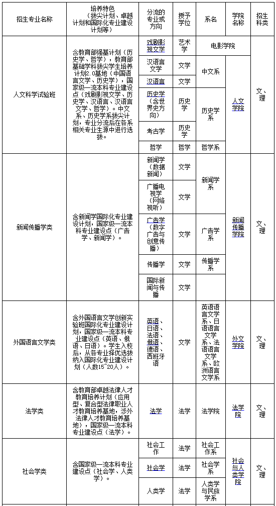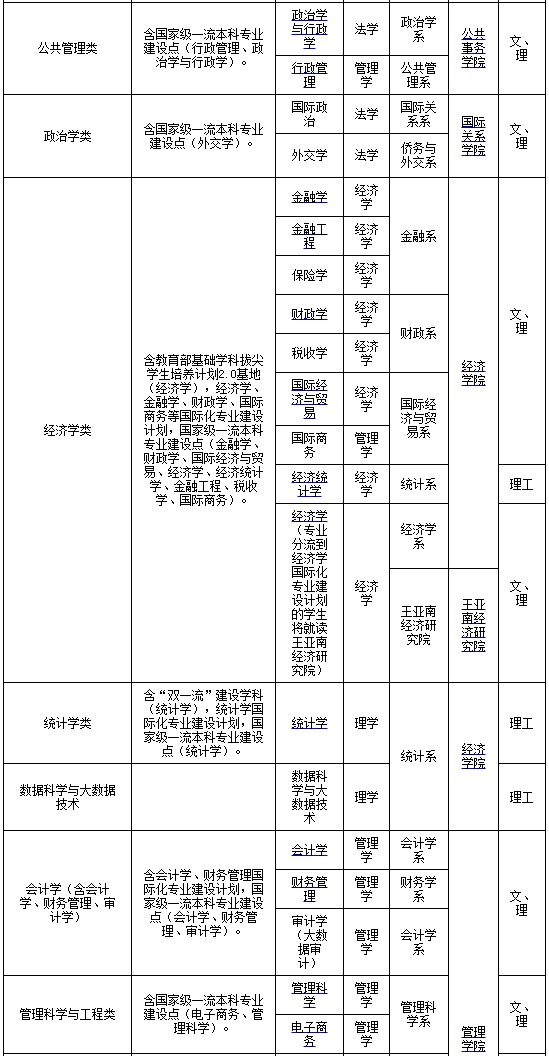 注:1.厦门大学实行“宽口径、厚基础、跨学科、国际化、重实践、求创新、多元化”的人才培养模式,按照《厦门大学大类招生的学生选择专业暂行办法》进行专业分流,确定专业(或方向)。